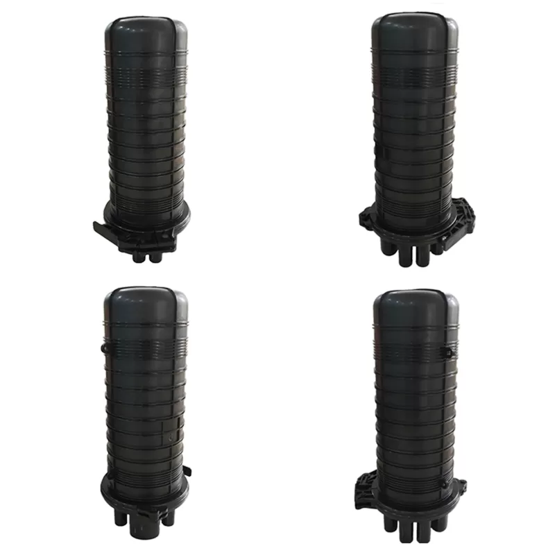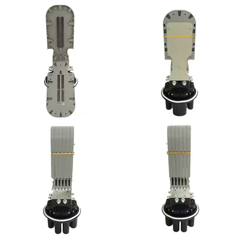 Dome Fiber Optic Splice Closure is used in aerial, wall-mounting applications, for the straight-through and branching splice of the fiber cable. The closure has seven entrance ports on the end (six round ports and one oval port). The shell of the product is made from ABS. The shell and the base are sealed by pressing the silicone rubber with clamp allocated. The entry ports are sealed by heat-shrinkable tube. The closures can be opened again after be sealed, reused again without changing the sealing material.