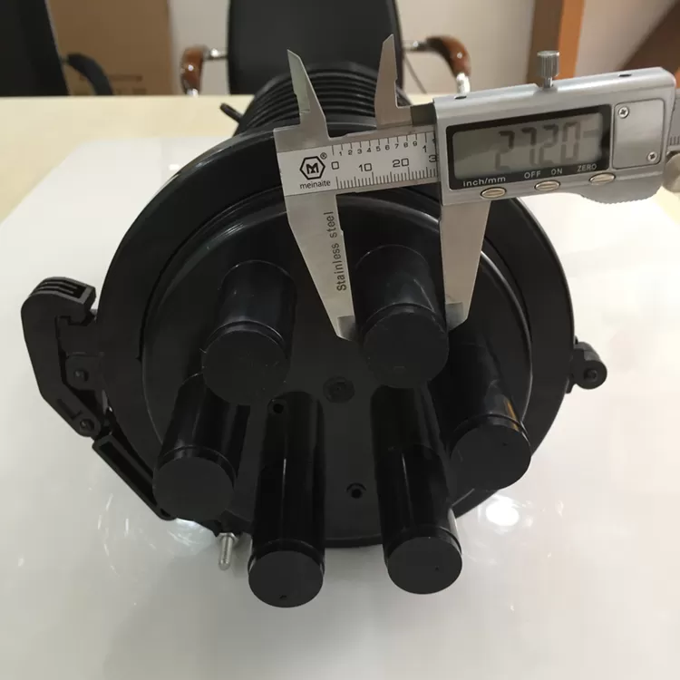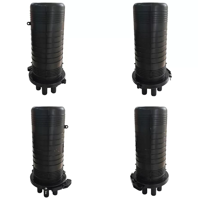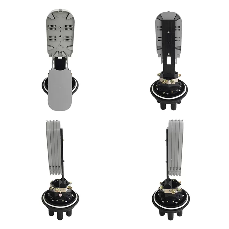 The Dome Fiber Optic Splice Closure is used in aerial, wall-mounting applications, for the straight-through and branching splice of the fiber cable. The closure has six entrance ports on the end (six round ports). The shell of the product is made from ABS. The shell and the base are sealed by pressing the silicone rubber with clamp allocated. The entry ports are sealed by heat-shrinkable tube. The closures can be opened again after be sealed, reused again without changing the sealing material.