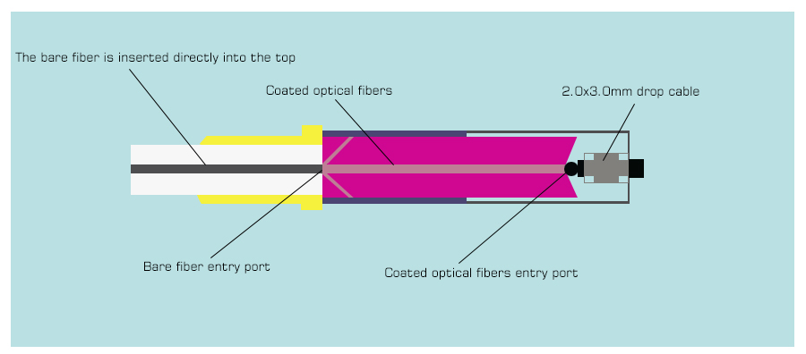2. Pre- terminated fast connector:the fiber is pte installed in the ferrule and polished.when install, the end user only need well cut the fiber with fiber cleave and use hand to connect cable.There is matching liquid in the ferrule fange, and well polished thus have better return lods result and easy install. The product structure principle is as follows: