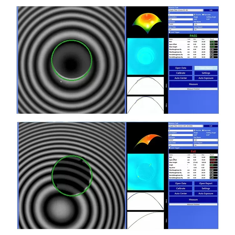 fiber enderface interferometer is used to measure radius of curvature, Apex Offset,Fiber height, Polishing angle and key error of APC connector and roughness parameter of the enderface.The software of SANA can show 3D surfacetopography of the connectors clearly.