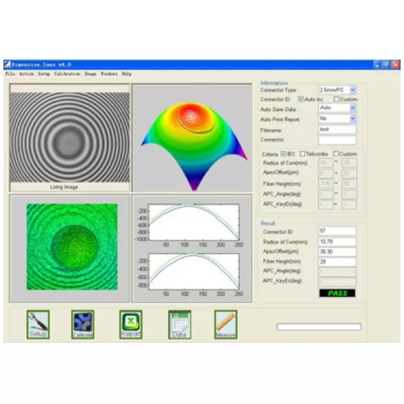 Interferometer measurement software unique Chinese and English operation interface, free conversion and other quick functions, the operation interface is intuitive;Its lifelike 3D restore ability enables users to visually judge the state of optical fiber end face, generate surface roughness diagram and vertex profile diagram at the same time, and assist engineers to improve the grinding process.Data report and chart report of each measurement can be generated automatically and randomly for data analysis and preservation.
